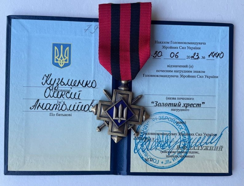 Начальник медичної служби 79 батальйону калушанин Олексій Кузьменко отримав почесний нагрудний знак “Золотий Хрест” від головнокомандувача ЗСУ Валерія Залужного.