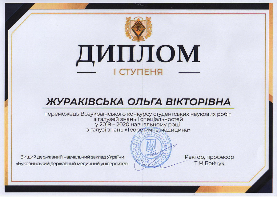 У конкурсі здобула перемогу студентка третього курсу медичного факультету ІФНМУ Ольга Жураківська. Вона представила наукову роботу з гістології, цитології та ембріології «Морфофункціональні зміни ендокринної системи серця і надниркових залоз при стрептозотоциновому цукровому діабеті». Керував науковою роботою професор Сергій Геращенко.