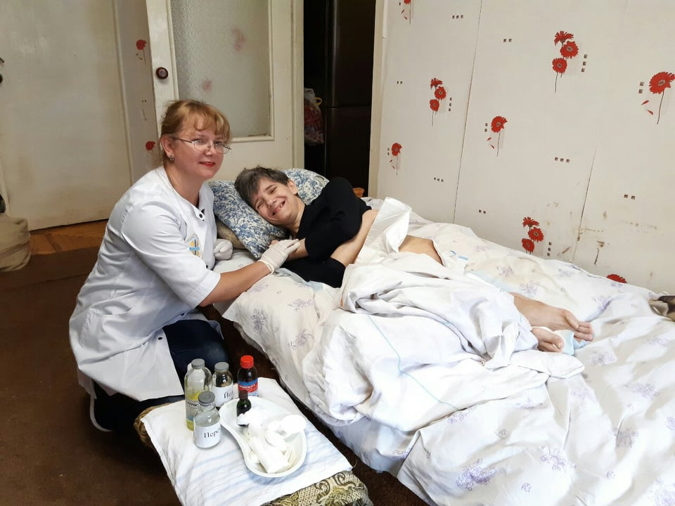 На початках пані Надія могла ще сидіти в кріслі, а зараз жінка прикута до ліжка. Під час першого візиту мультидисциплінарної виїзної бригади Карітасу Івано-Франківська у жінки виявили пролежні, що виникли через недбале поводження родичів з хворою. Насамперед, пані Надія не мала комфортного ліжка, а вузький диван змушував її лежати в одному незручному положенні. Рідним було важко повертати хвору та проводити різні маніпуляції по догляду. Та найгірше, що кидалося в очі – це байдужість близьких до важкохворої.