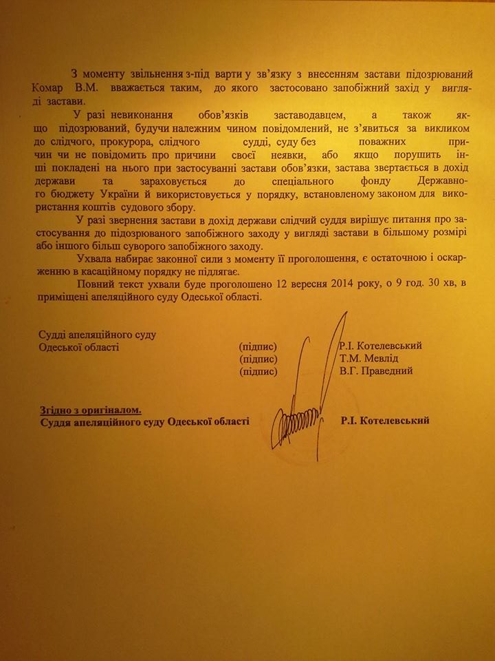 Рішенням суду розмір застави зменшено до 50 мінімальних зарплат (в районі 60900 гривень).