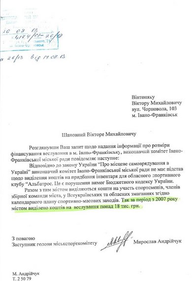 На запит «Альбатросу» щодо надання інформації про розміри фінансування веслування в м.Івано-Франківську за підписом заступника голови міськспорткомітету М.Андрійчука надійшла відповідь, відповідно до якої «…Так за період з 2007 року (за 6 років) містом виділено коштів на веслування понад 18.000 грн».