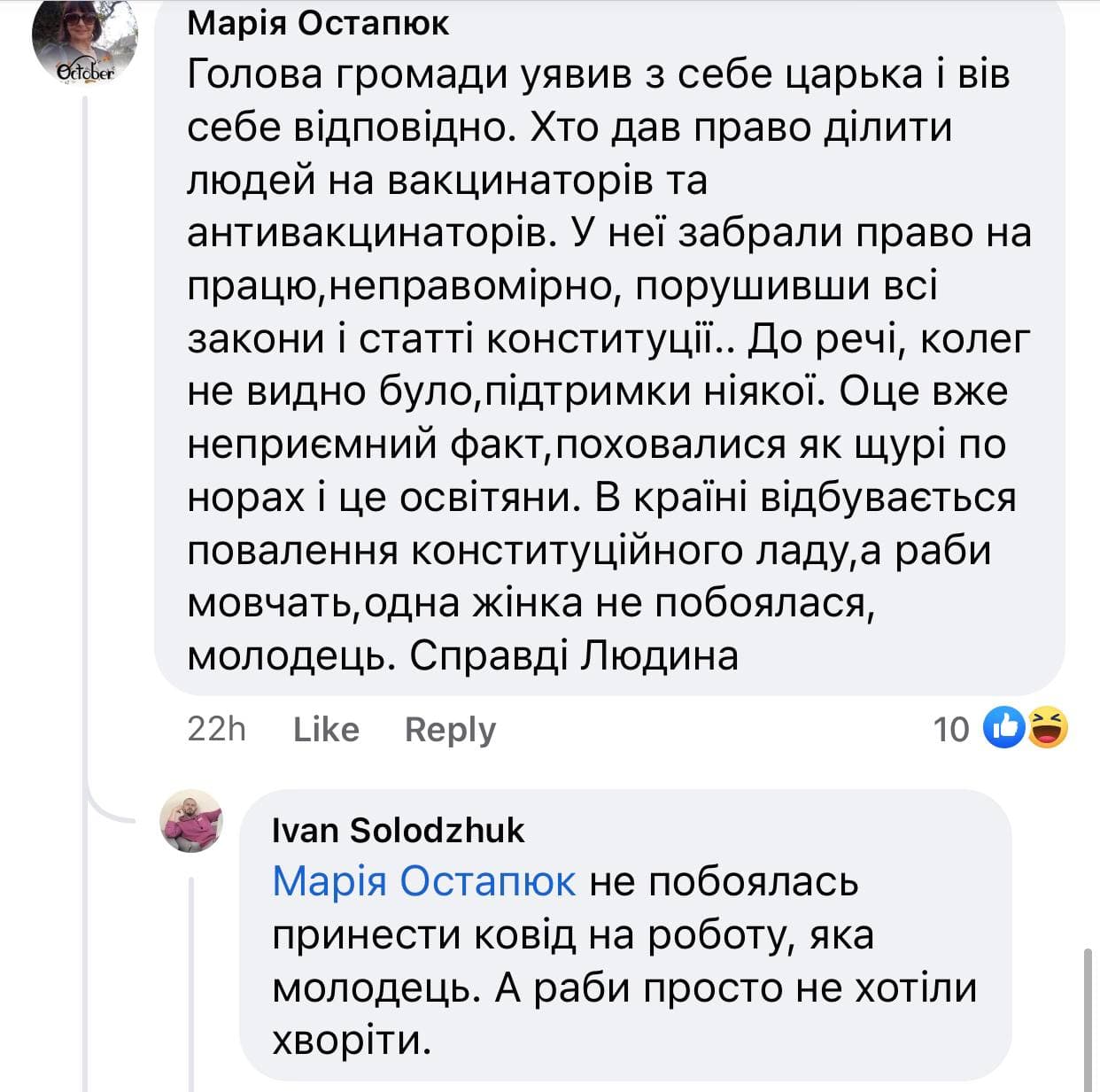 Не менше коментували й новину про те, що вчителька, яку відсторонили від роботи з 8 листопада, вирішила «повоювати» та обрала своїм союзником відомого антивакцинатора Остапа Стахіва.