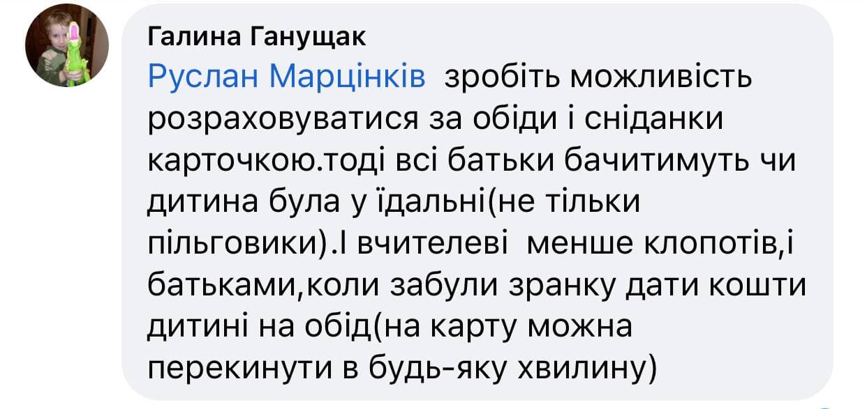Планується, що вже з січня наступного року батьки матимуть на сайті персональні кабінети. В них розміщуватиметься інформація за кожен день і батьки знатимуть чи їхня дитина снідала, чи обідала в школі.