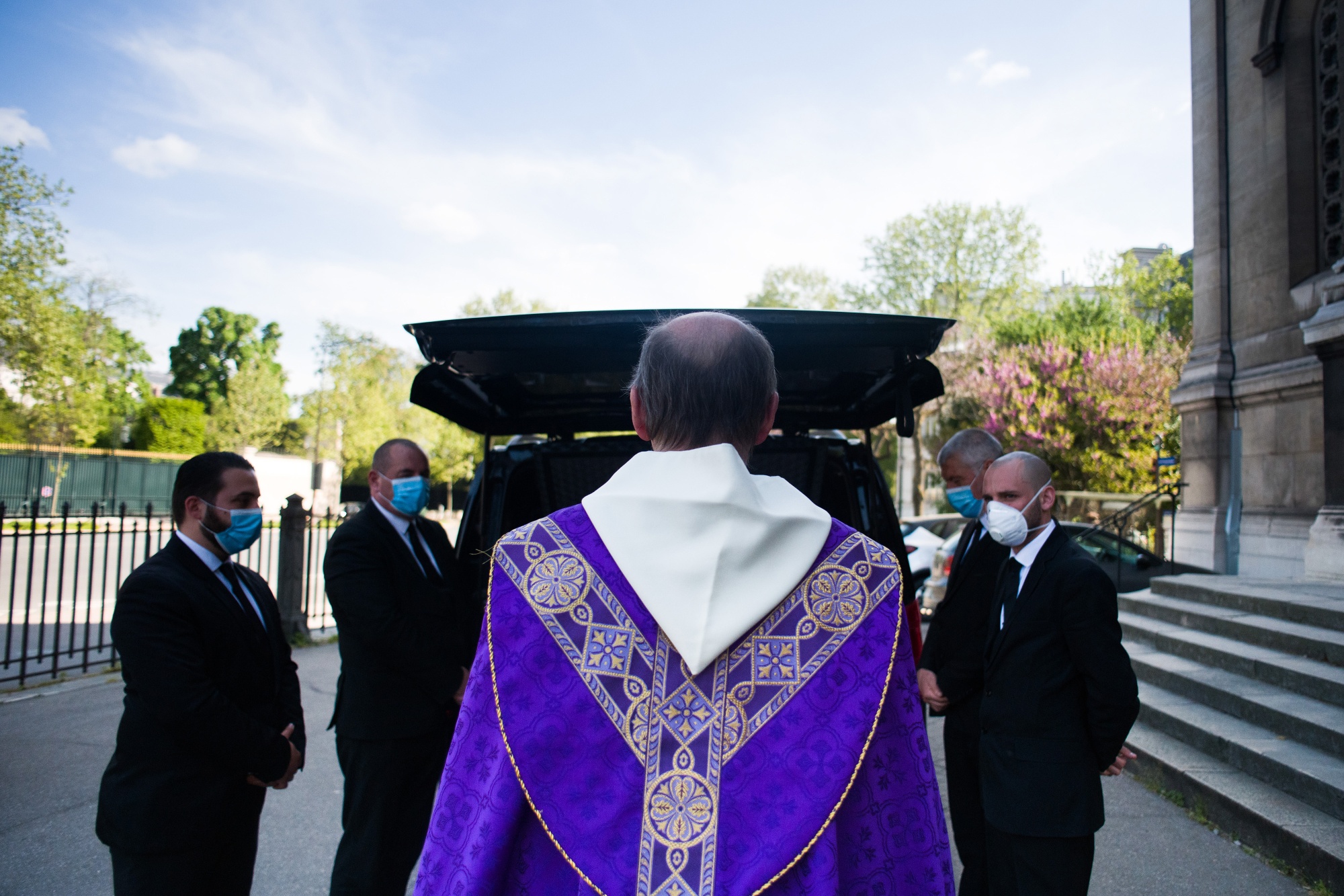 Носії труни та священник збираються на похоронах у Парижі 16 квітня. Фотограф: Nathan Laine / Bloomberg