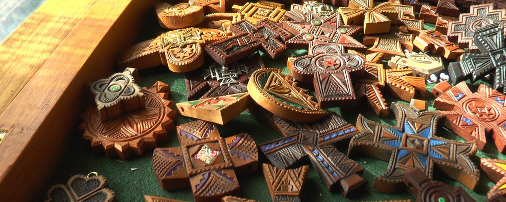 Орнаментальні ікони, тарілки, картини, копії гуцульських ручних хрестів, традиційні зґарди та сучасні прикраси виготовляє родина косівських різьбярів Стринадюків.