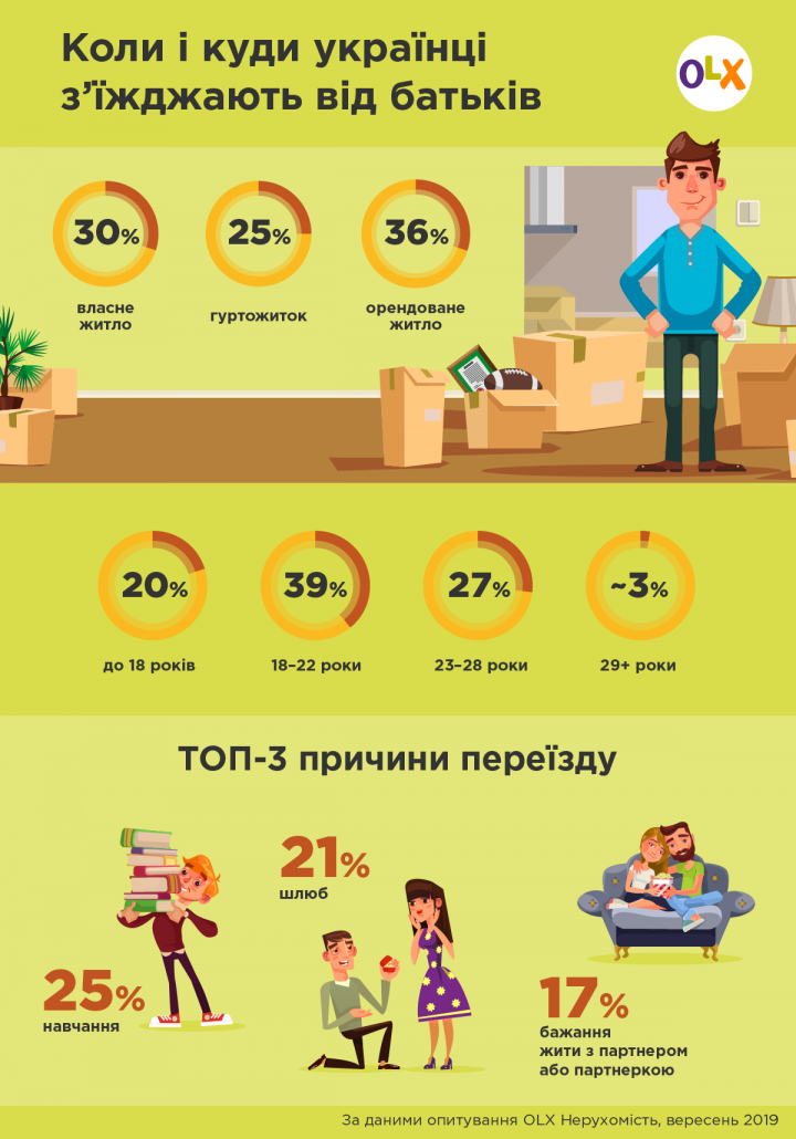 “78% українців хоча б один раз переїжджали від батьків. З них 6% з’їжджали двічі, а 10% повернулись і зараз живуть з батьками. Найчастіше, у 39% випадків, змінюють місце проживання у віці 18-22 років. Навчання та шлюб – головні причини першого переїзду. При виборі помешкання українці найбільше уваги звертають на розташування, вартість та стан житла”, – йдеться в повідомленні.