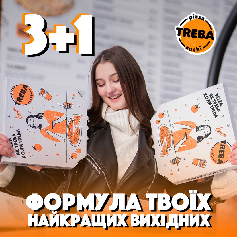 3+1 – 3 піци в додатку чи на сайті treba.pizza замовляй, кожну 4-ту в подарунок забирай!