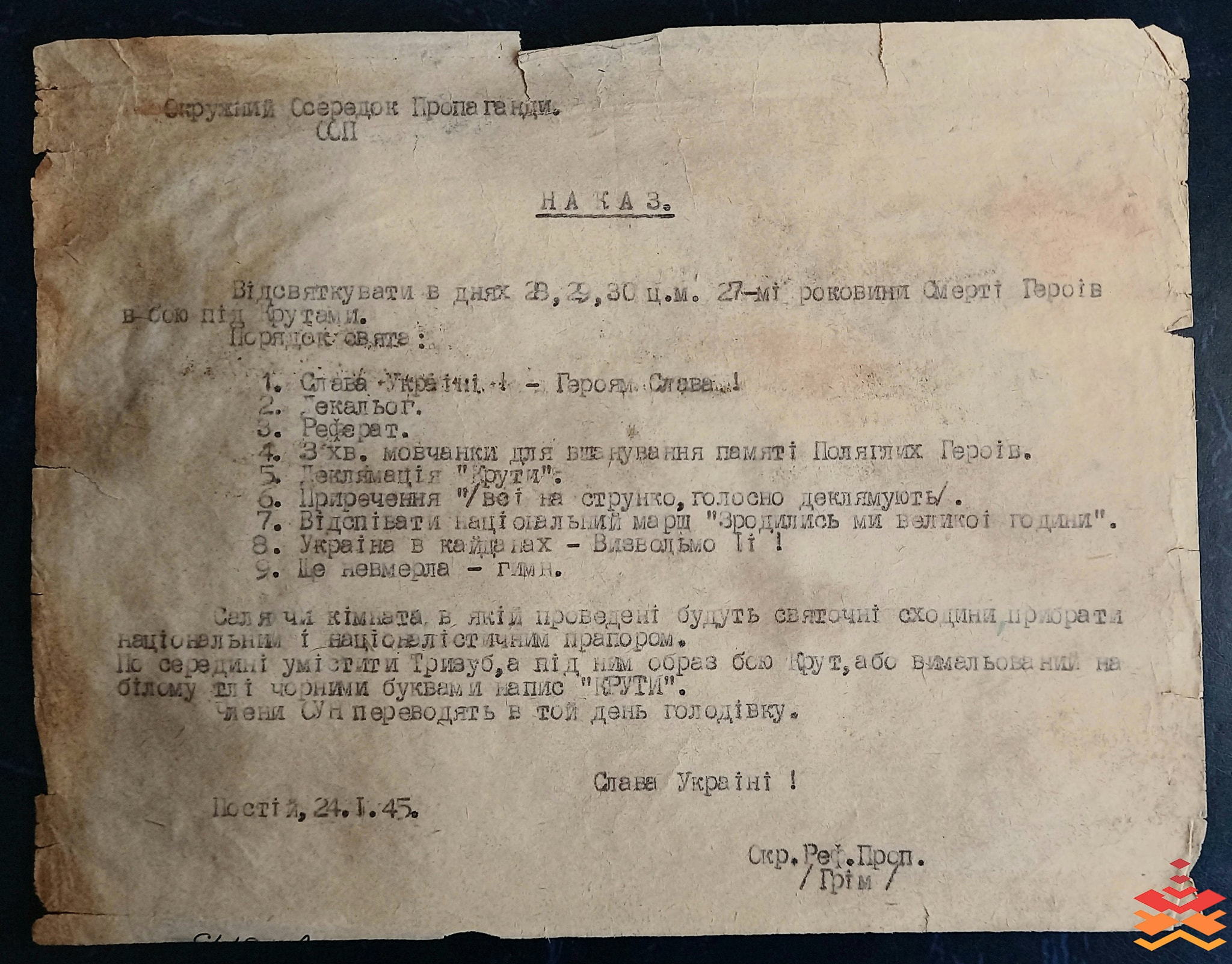 Фото експоната із фондів ІФКМ: документ з архіву УПА про заходи із вшанування пам'яті Героїв Крут.