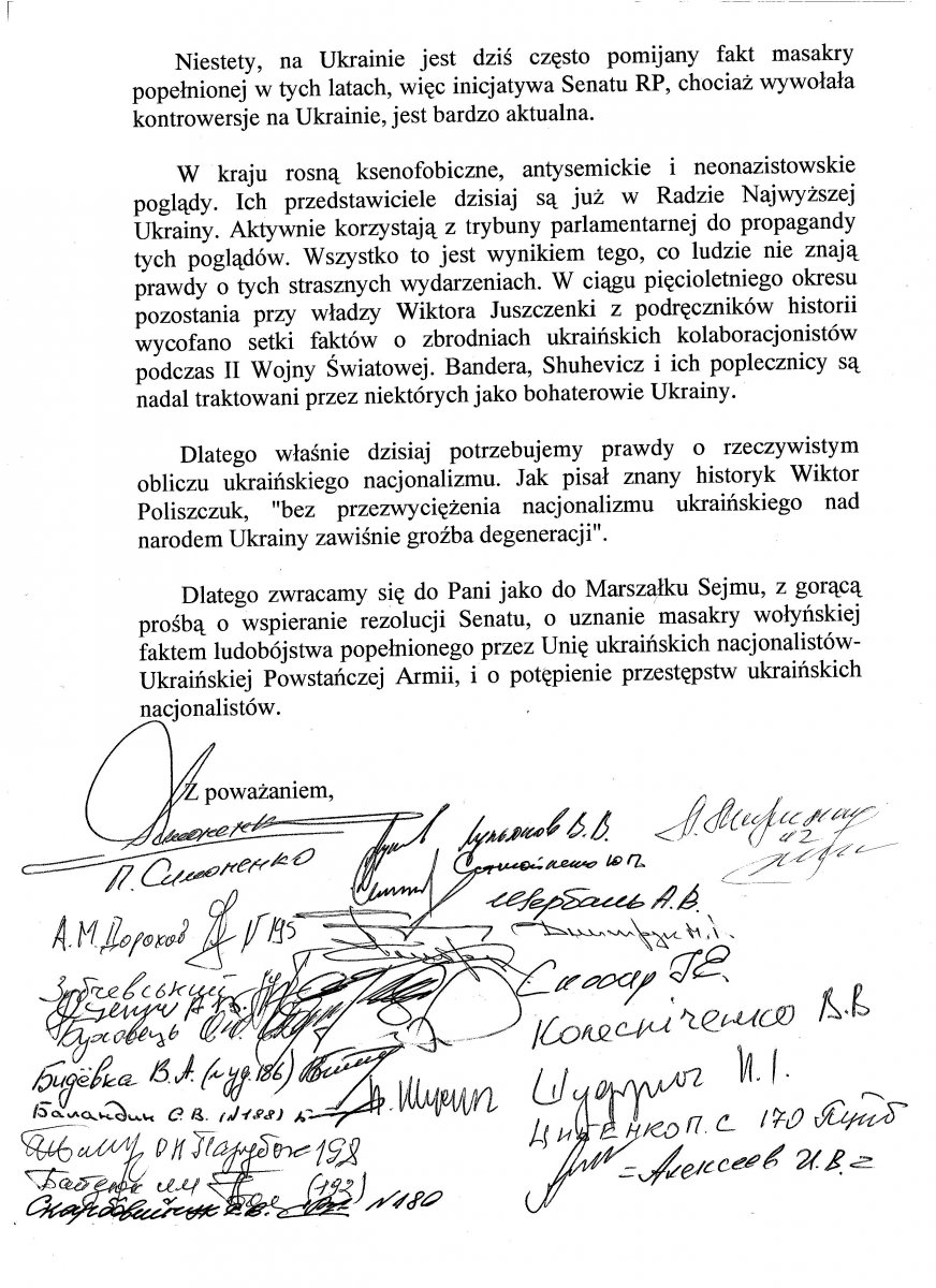 "Просимо вас, депутатів Сейму Республіки Польща, підтримати рішення сенату, визнати Волинську різанину ОУН-УПА геноцидом щодо польського населення і засудити злочинні діяння українських націоналістів", - наголошується в документі. На переконання нардепів, які підписалися під листом, різна трактовка Волинського злочину "забиває клин між двома країнами".