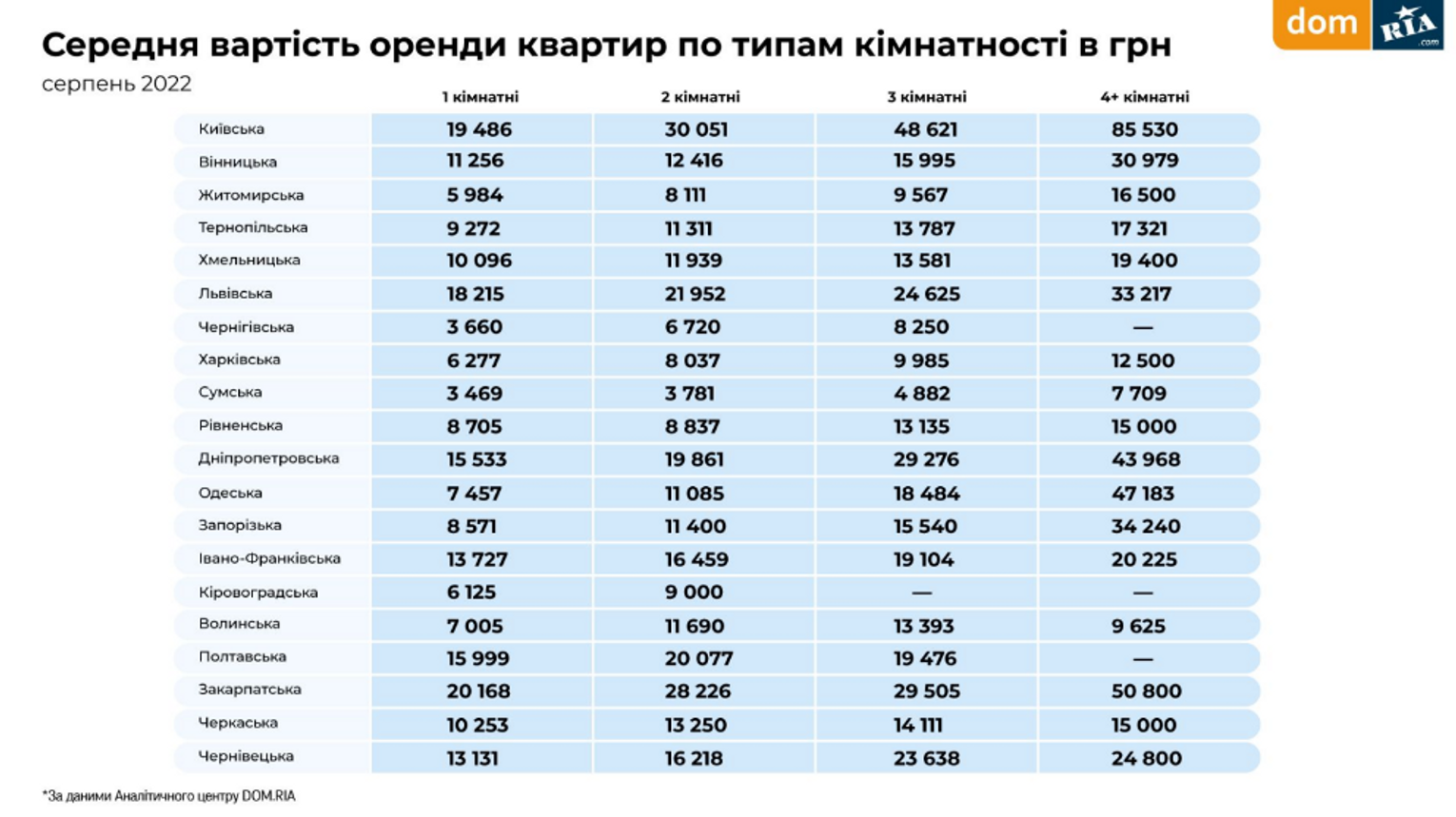 Експерти зазначають, що за місяць вартість оренди зросла у всіх областях України, окрім Кіровоградської області (там середня ціна на оренду впала на 20%).