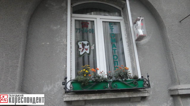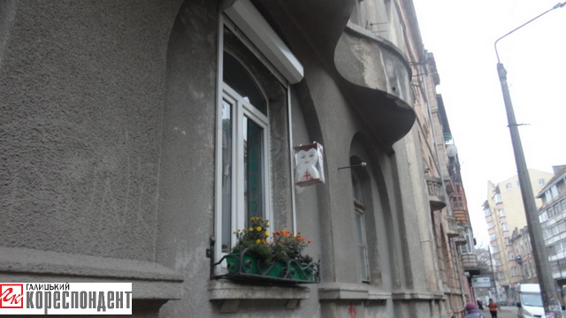 Вхід в стоматологічний кабінет з боку вул. Грюнвальдської, а вікна виходять на вул. Гаркуші. На вікні ще видно рекламу, а біля входу вже вивіску забрали.