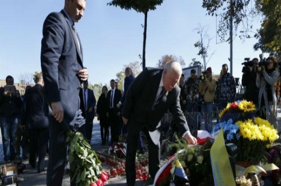 Мер Києва Віталій Кличко та екс-президент Польщі, лауреат Нобелівської премії миру Лех Валенса вшанували пам'ять героїв Небесної Сотні й поклали квіти до меморіального хреста на вулиці Інститутській. Колишній польський президент не стримав емоцій і заплакав.