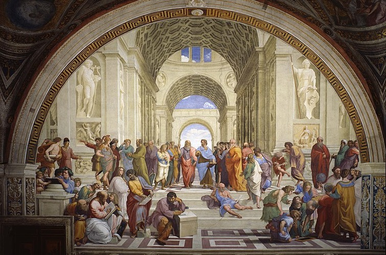 На "Афінській школі" зображені філософи античності: Платон і Арістотель в оточенні Сократа, Геракліта, Піфагора та інших.