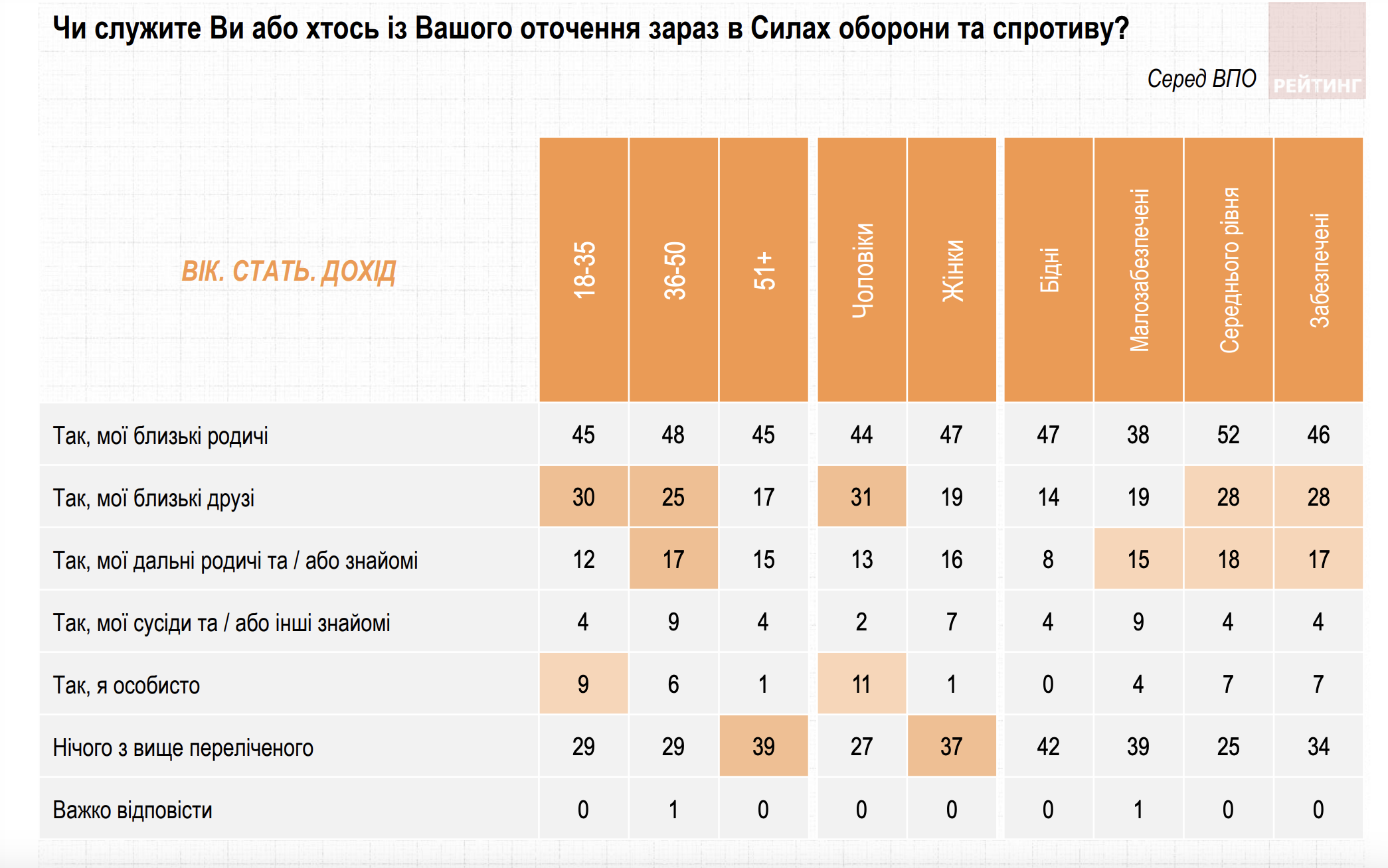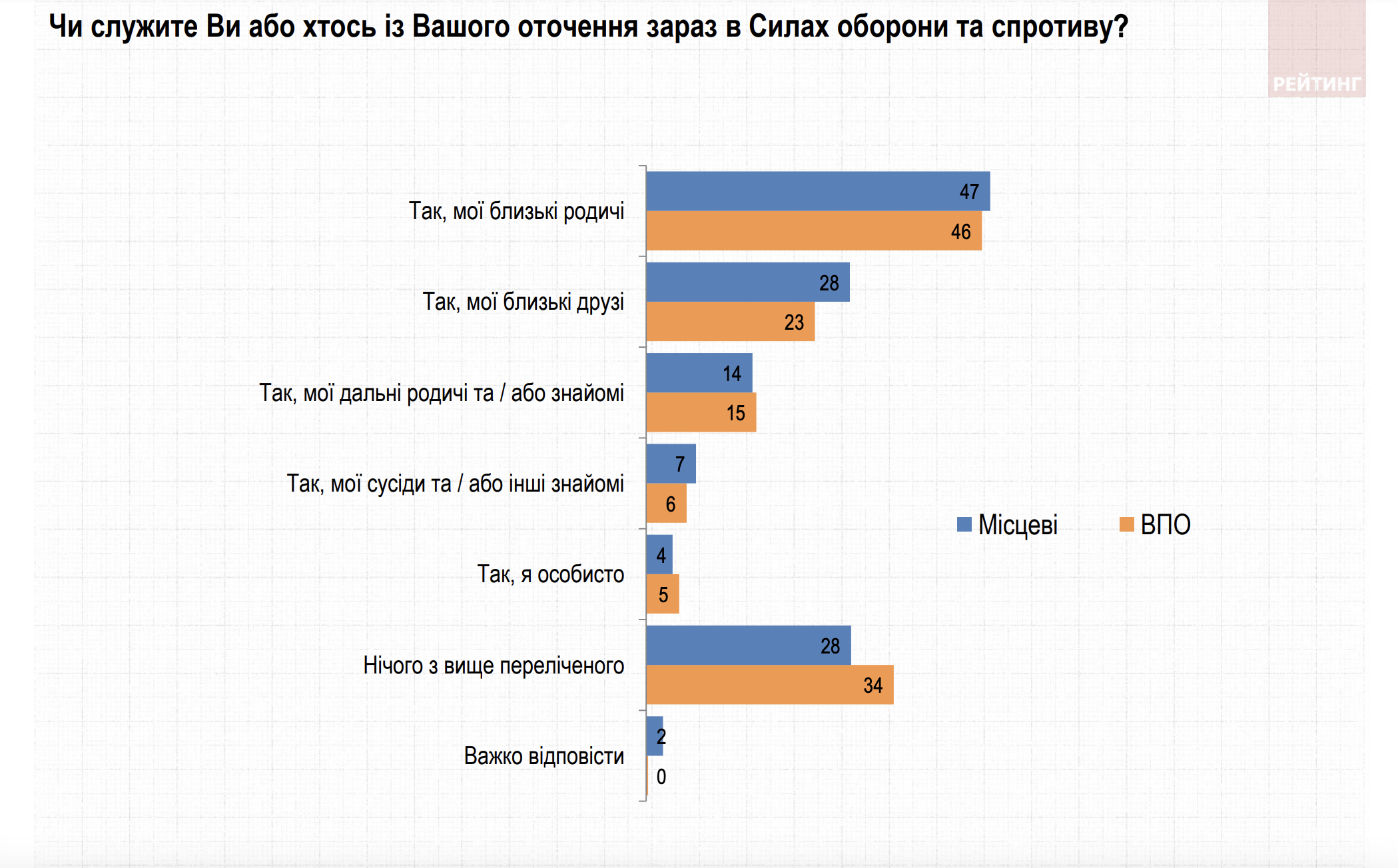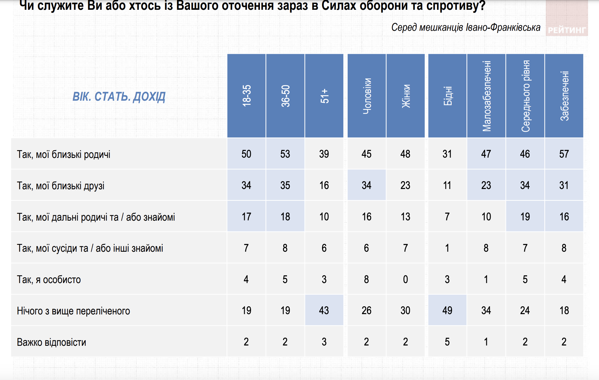 Про наявність тих, хто служить серед близьких друзів говорили 28% іванофранківців (23% серед ВПО), серед далеких родичів чи знайомих — 14-15%, серед сусідів чи інших знайомих — 6-7%, про особисту службу — 4-5%.