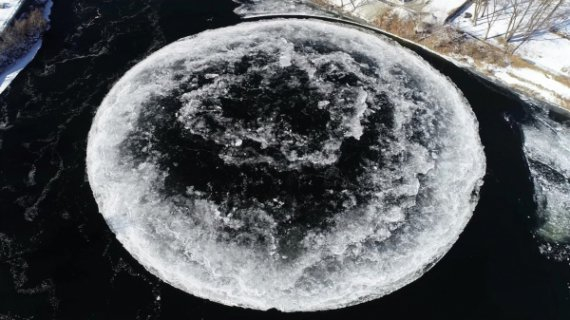 У США на річці в місті Вестбрук штату Мейн, утворився велетенський крижаний диск, що обертається. У діаметрі він має більше 90 м.