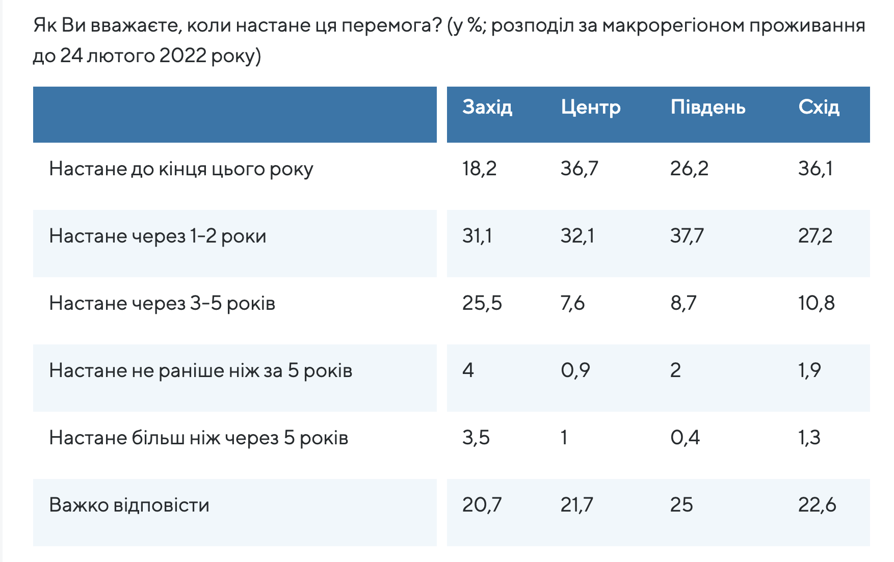 Зокрема, майже третина опитаних (31%) сподівається на те, що перемога настане до кінця 2023 року. На заході країни таких 18,2% опитаних.