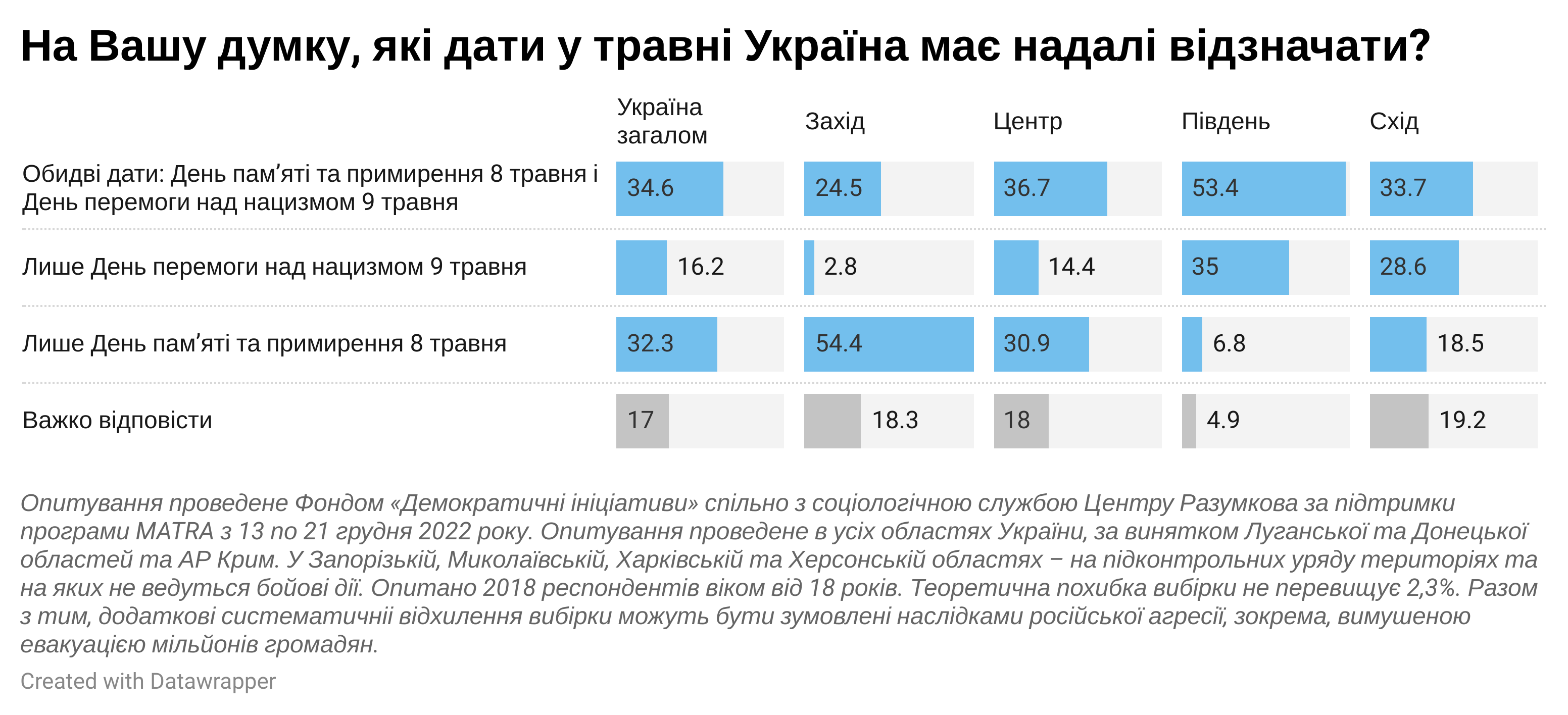 Так, близько третини громадян вважають, що необхідно відзначати обидві дати, як це відбувається нині: і День пам’яті та примирення 8 травня, і День перемоги над нацизмом 9 травня.