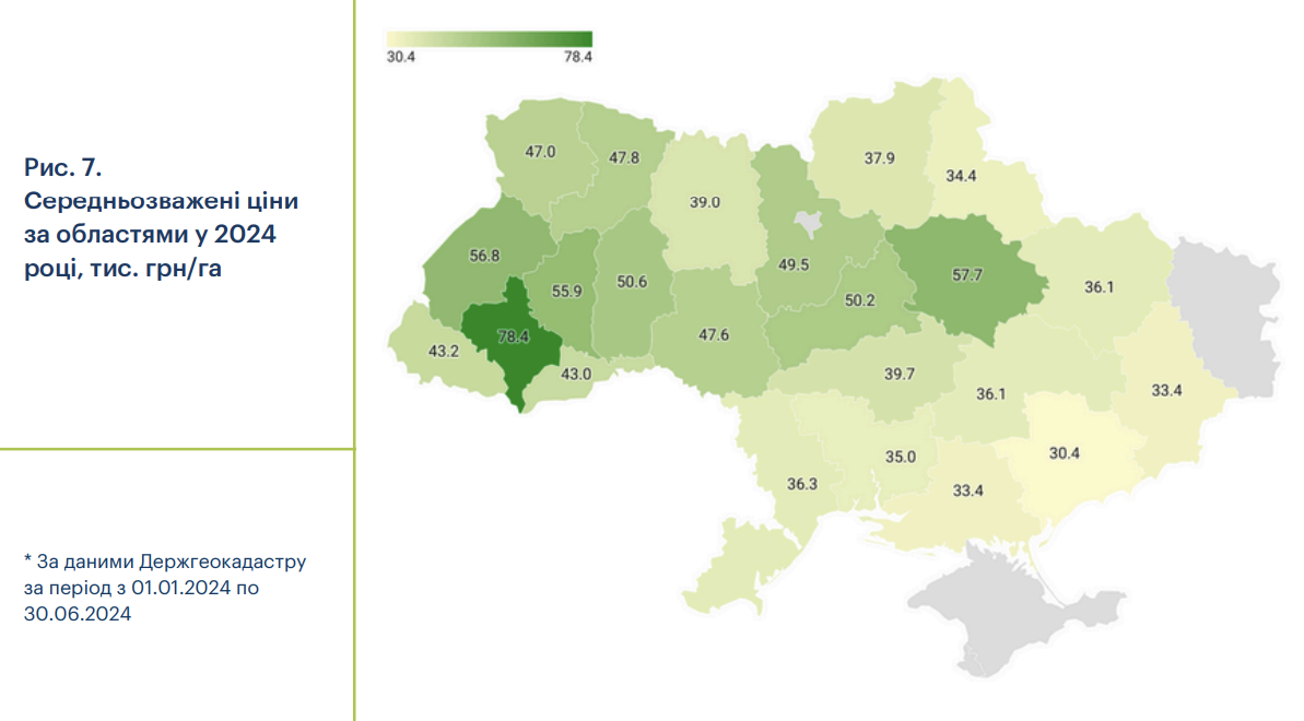 У різних регіонах країни вартість землі коливається у середньому на такому рівні: 30,4 — 78,4 тисячі гривень/га.