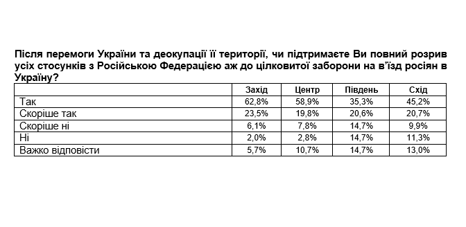 Зокрема, 86,3% мешканців західних областей виступають за повний розрив усіх, зокрема економічних та дипломатичних, стосунків з російським агресором, включно з цілковитою забороною на в’їзд росіян на територію України.