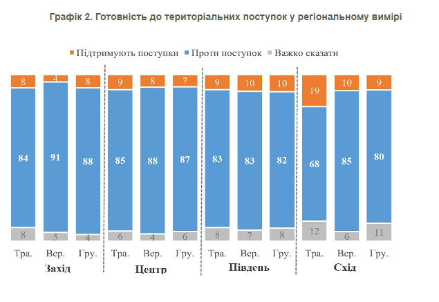 У цілому, для 85% опитаних респондентів в Україні жодні територіальні поступки не є припустимим. Лише 8% вважають, що для досягнення миру і збереження незалежності можна відмовитися від деяких територій.