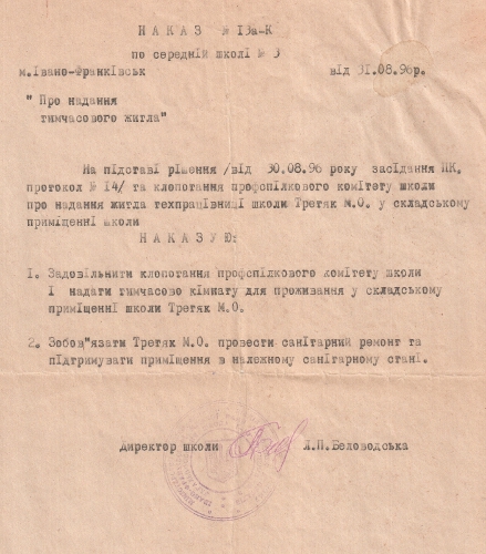 Вісімнадцять років тому у 1996 році технічній працівниці Івано-Франківської школи № 3 Мирославі Третяк надали для проживання кімнату в окремому одноповерховому будинку, який знаходиться у дворі цієї школи (до цього Мирослава Онисівна декілька років проживала у самій будівлі школи). Надавали це житло офіційно: 30 серпня 1996 р. на зборах профспілкового комітету школи вирішили звернутися до адміністрації школи із клопотанням про вирішення житлової проблеми Мирослави Третяк, а 31 серпня 1996 р. директор школи Лариса Біловодська підписує наказ про „надання тимчасово кімнати для проживання у складському приміщенні школи Третяк М.О.” (так зазначено у самому наказі), а саме в тому одноповерховому будинку.