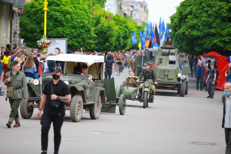 Також в Івано-Франківську пройшов Марш слави УПА. В ході взяли участь тільки реконструктори з військовою технікою.