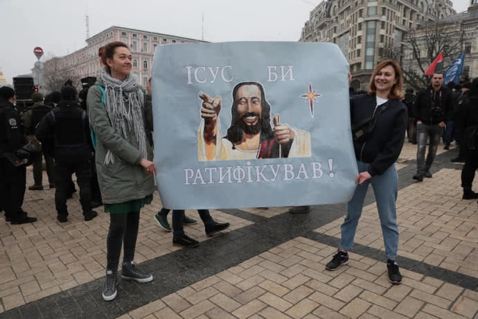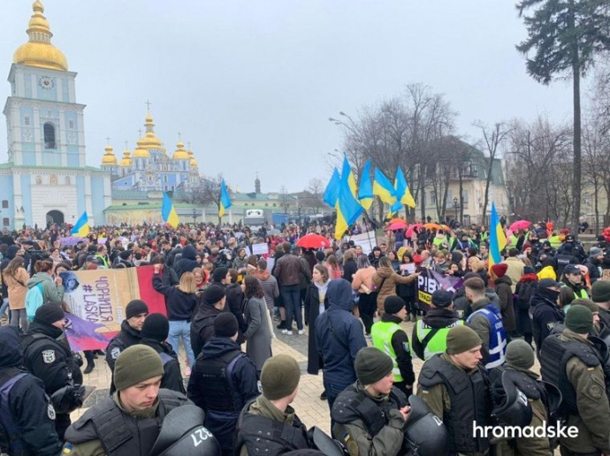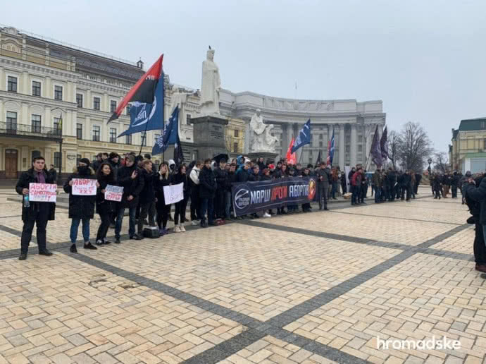 Як повідомляє Громадське, паралельно з Маршем жінок на Михайлівську площу вийшли кілька десятків людей на акцію "Жінки проти абортів". На ній присутні учасники організацій "Традиція і порядок", "Християнський фронт", також є представники "Правого сектору".