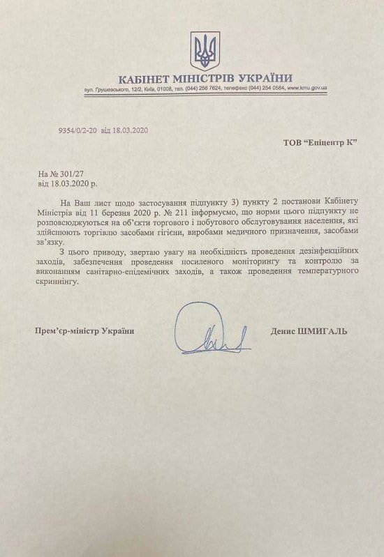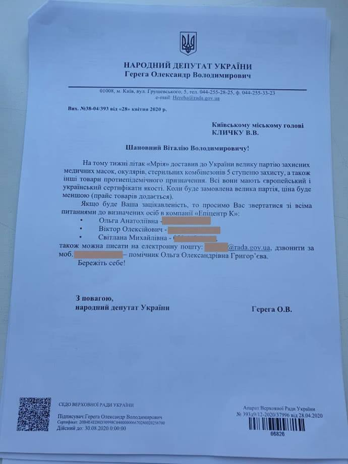 Нардеп Герега (він же - гігант «Епіцентр», який ані на мить не припиняв роботу, на відміну від малих підприємств) листом: «Мер Києва, ми завезли на «Мрії» велику партію протиепідеміологічних товарів, більше береш - більше знижка»