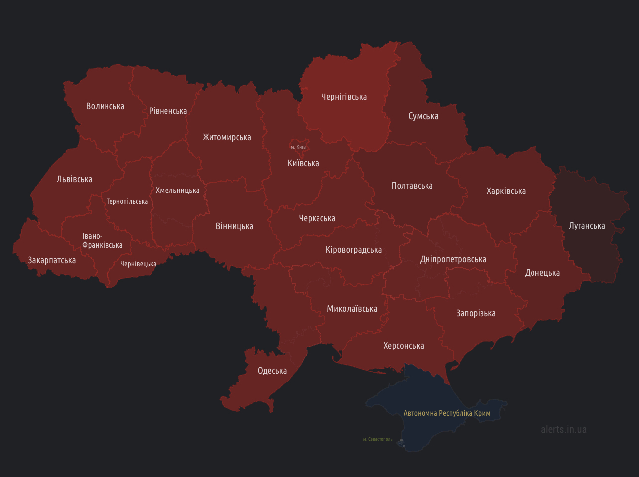 Станом на 9:40 ранку 22 жовтня по всій Україні, окрім тимчасово окупованого Криму, оголошена повітряна тривога.
