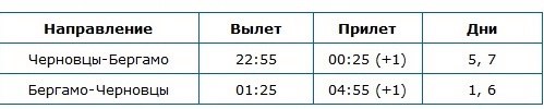 З 28 квітня з'явиться рейс з Чернівців в аеропорт Бергамо, розташований в 60 км. від Мілану. Літати по цьому маршруту МАУ буде двічі в тиждень: вильоти з Чернівців щоп'ятниці і воскресінням, вильоти з Бергамо - щопонеділка і суботам.