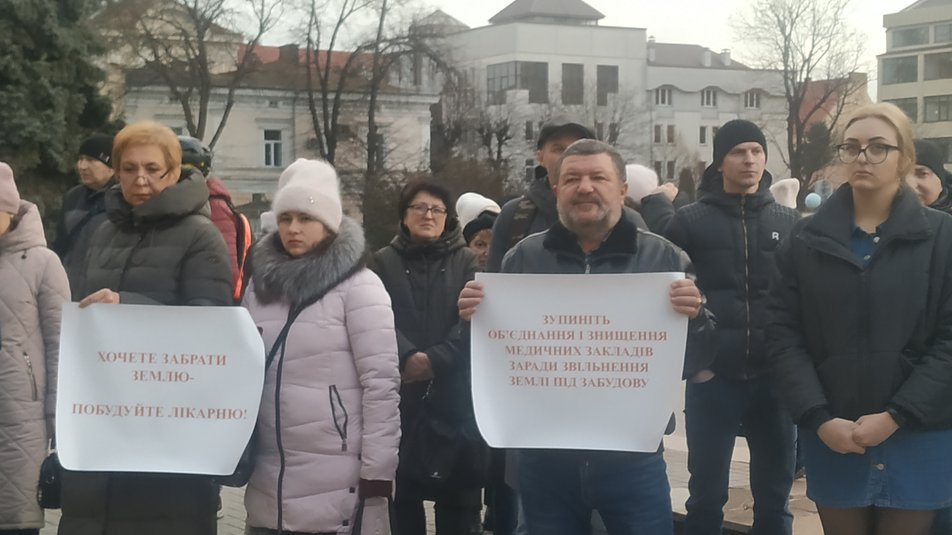 22 лютого з плакатами "Зупиніть об'єднання і знищення медичних закладів заради звільнення землі під забудову" та "Хочете забрати землю — побудуйте лікарню" медики прийшли до будівлі обласної військової адміністрації.