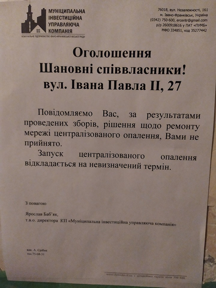 Відтак, у МІУК кажуть, що проведуть ще одні збори та спробують переконати співвласників у необхідності виконання ремонту. В іншому випадку, тепловики не зможуть забезпечити початок опалювального сезону по цьому будинку.
