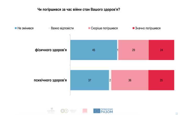 В Україні більша частина опитаних зазначили про погіршення стану власного фізичного здоров’я, натомість понад 60% — поскаржилися на погіршення психічного стану здоров’я.