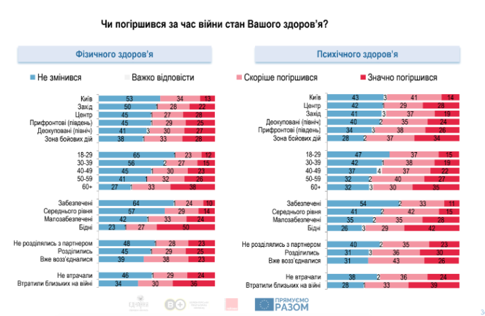 Так, погіршення психічного та фізичного здоров’я здебільшого спостерігається серед мешканців деокупованих територій та зон бойових дій, а також серед тих, хто втратив рідних на війні.