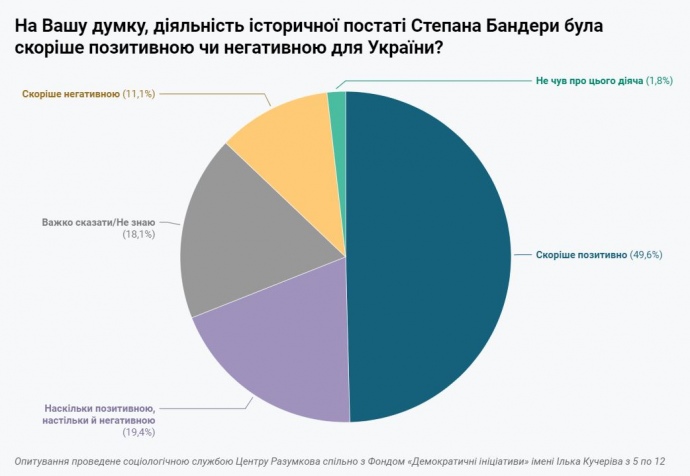 Ще 19% зазначили, що ставляться до діяльності Бандери як позитивно, так і негативно, близько 18% не змогли відповісти на це запитання. При цьому 2% опитаних респондентів сказали, що не чули про такого українського політичного діяча.