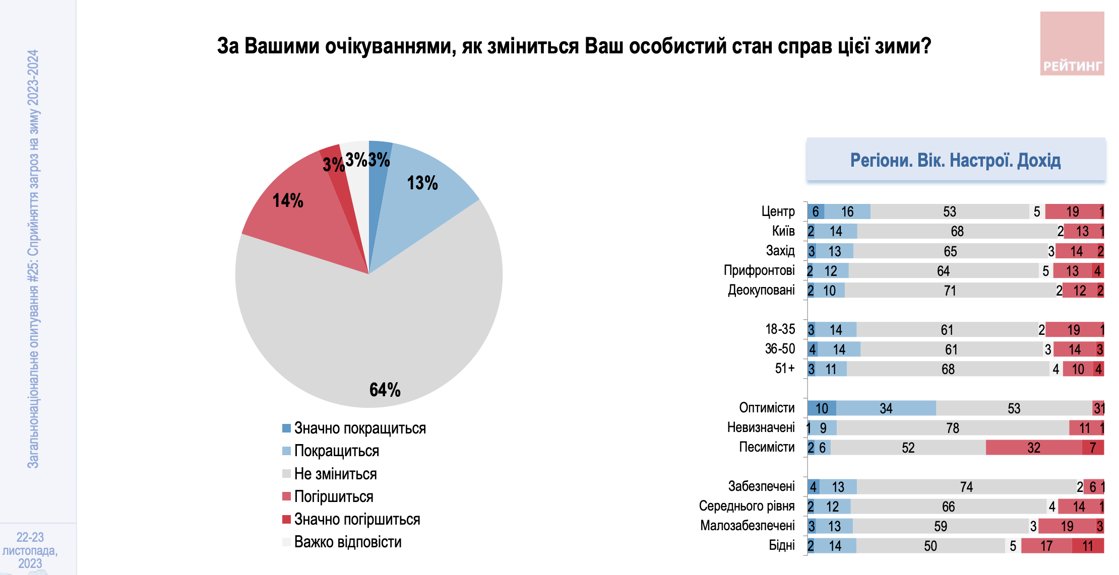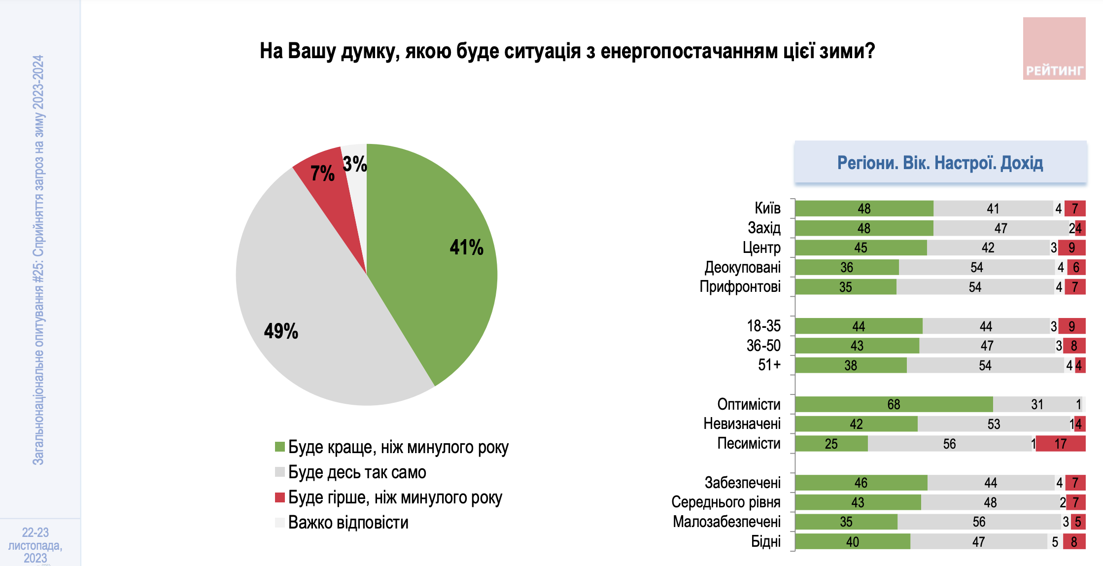 За своїми очікуваннями ситуації цієї зими респонденти поділяються на три групи: песимісти (25%), оптимісти (21%) та ті, хто не визначився зі своїми очікуваннями (54%).
