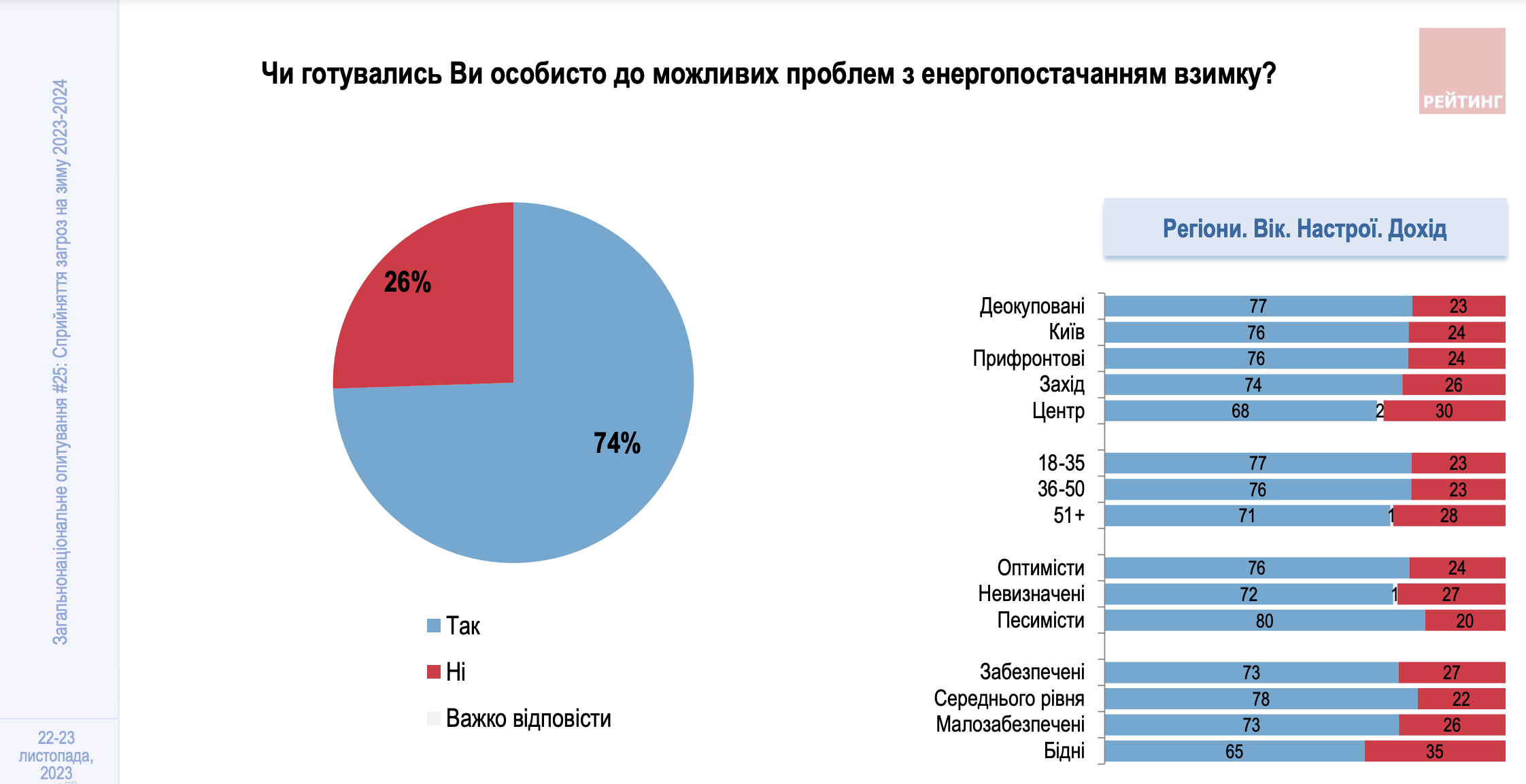 На інтенсивність підготовки до проблем з енергопостачанням впливають і настрої щодо того, з якими проблемами зіткнеться Україна взимку: песимісти в очікуванні складнощів докладають більше зусиль для підготовки до зими, ніж оптимісти.