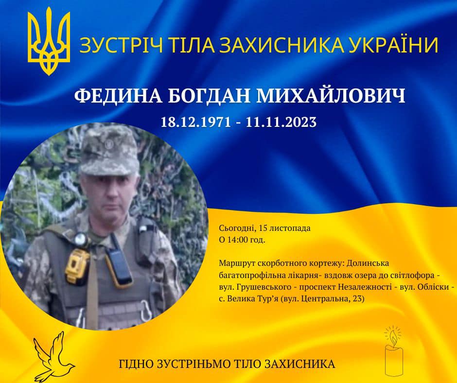"Скорботний кортеж проїде маршрутом: Долинська багатопрофільна лікарня - вздовж озера – кільце – світлофор – вул. Грушевського – проспект Незалежності – вул. Обліски - с. Велика Тур‘я (вул. Центральна, 23).