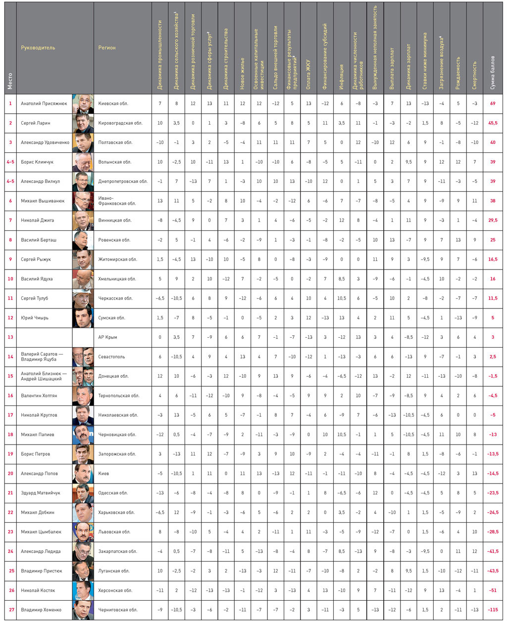 Михайло Вишиванюк набрав «мінусів» у таких категоріях: динаміка сфер послу (-2), освоєні капітальні інвестиції (-4), сальдо зовнішньої торгівлі (-2), фінансові результати підприємств (-12), фінансування субсидій (-6), динаміка чисельності працівників (-7), вимушена неповна занятість (-8) , виплата зарплат (-5), забруднення повітря (-9).