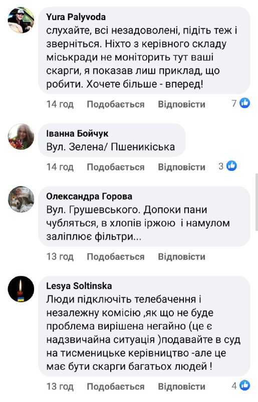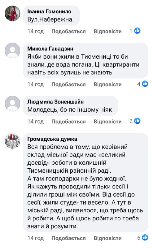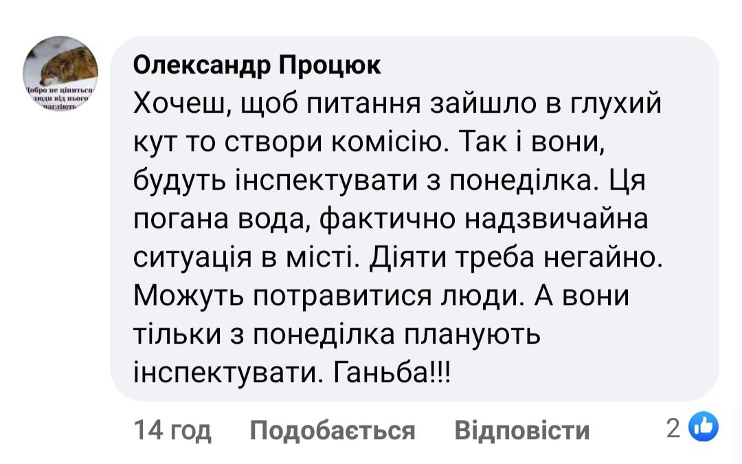 Тисменичанин також закликав у коментарях під дописом вказувати вулиці, де ще така вода, адже, стверджує, міськрада нічого не знає про проблеми міста.