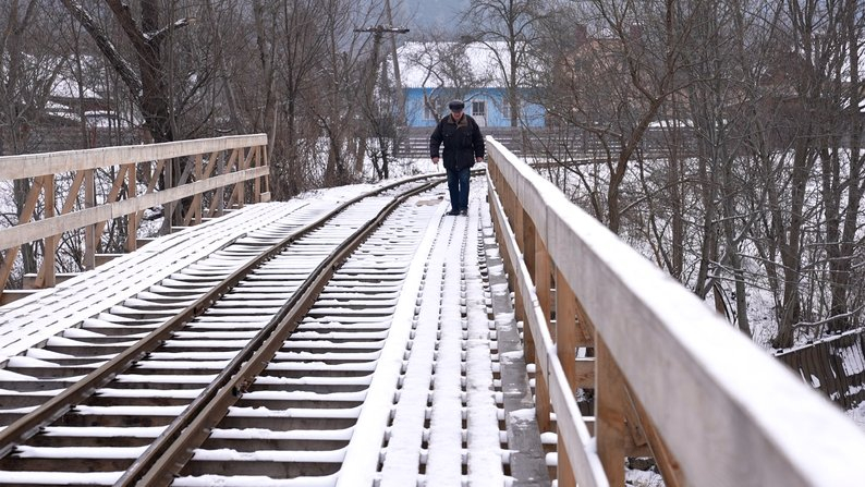 Жителька Нового Мізуня переводить сина через вузькоколійний міст.