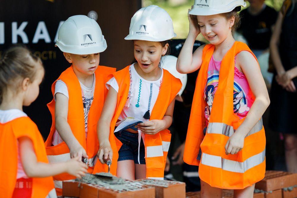 Дітлахи охоче розмішували бетонну суміш і зводили з цегли справжні будинки. Звісно, допомагали їм у цьому дорослі - досвідчені співробітники БК “Вертикаль”.