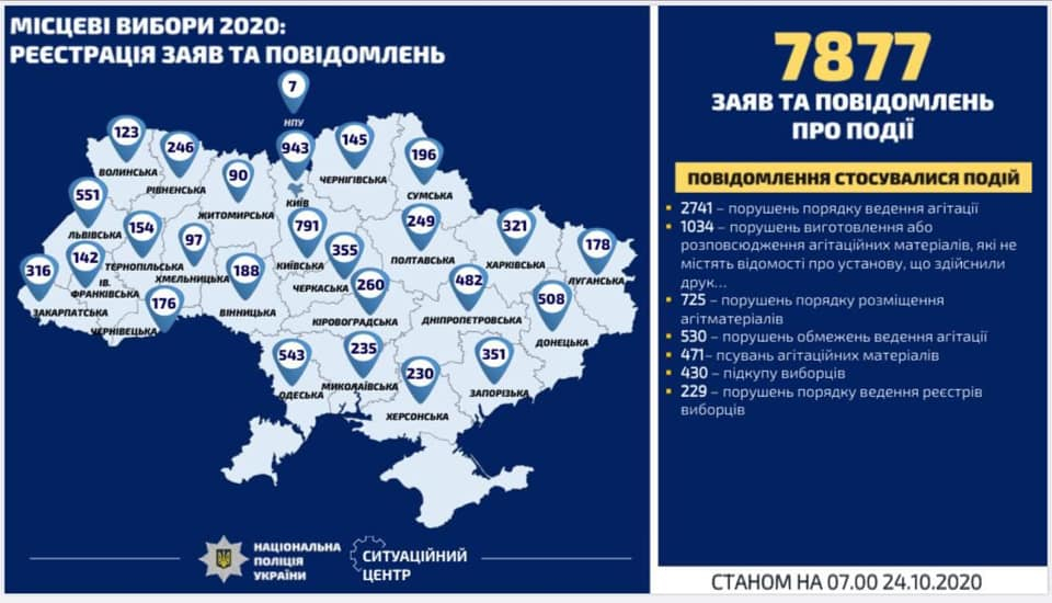 Відповідно до частини 7 статті 23 «Публічність і відкритість виборчого процесу» Виборчого кодексу України, органи Національної поліції України за день до дня голосування оприлюднюють на офіційних веб-сайтах попередні відомості про кількість зареєстрованих звернень про порушення виборчого законодавства під час відповідного виборчого процесу та роз’яснення відповідальності за порушення законодавства про вибори.