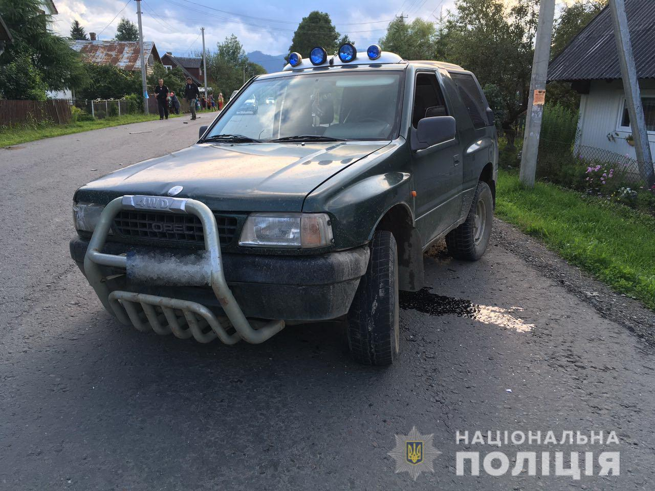 26-річний водій позашляховика у результаті зіткнення здійснив наїзд на малолітню дівчинку, яка знаходилась на узбіччі дороги. Потерпілих доставили в травматологічне відділення місцевої районної лікарні. Транспортні засоби поміщені на спецмайданчик поліції, у водіїв відібрано взірці крові на стан алкогольного сп’яніння.