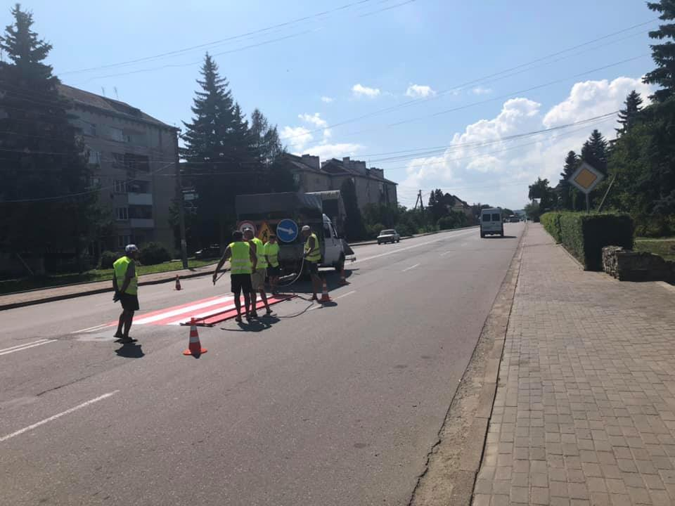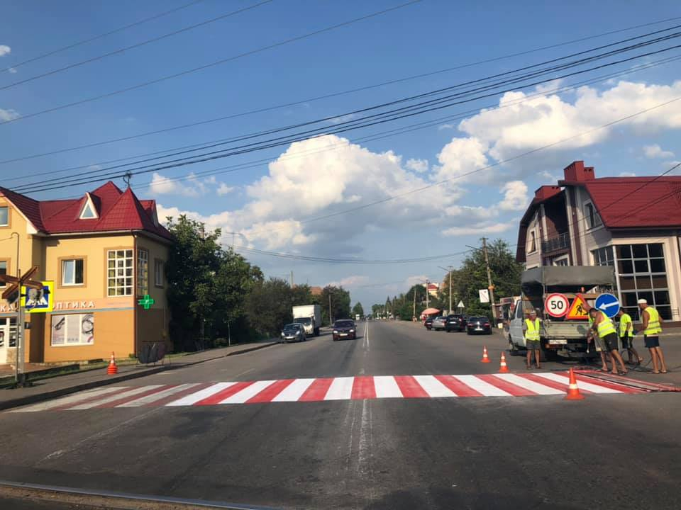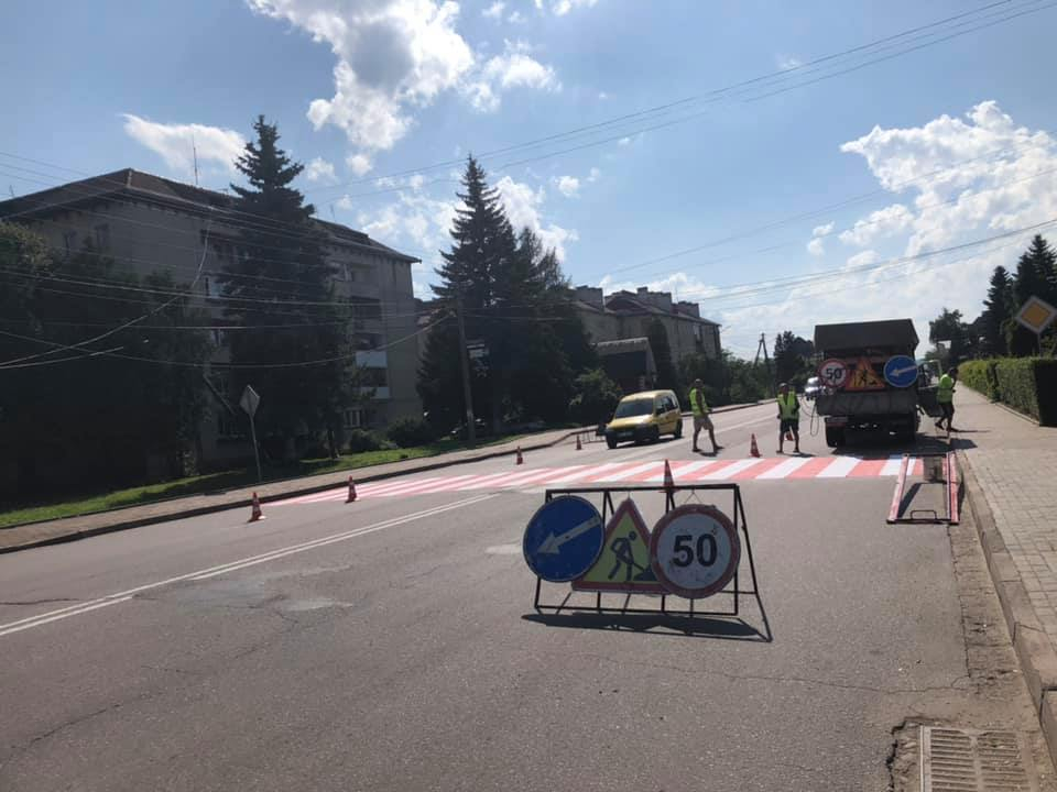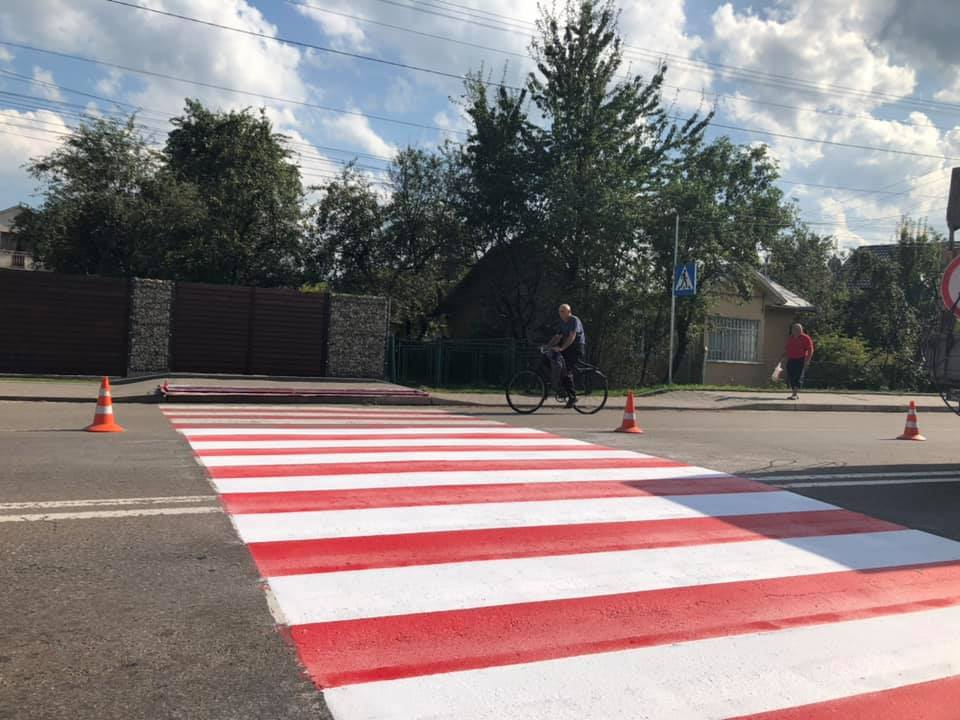 Працівники підрядного підприємства на замовлення Служби автомобільних доріг в Івано-Франківській області нанесли зокрема три нові пішохідні переходи (у с. Креховичі поруч із перехрестям) та в смт Брошнів-Осада (біля селищної ради), а також ще п’ять поновили.