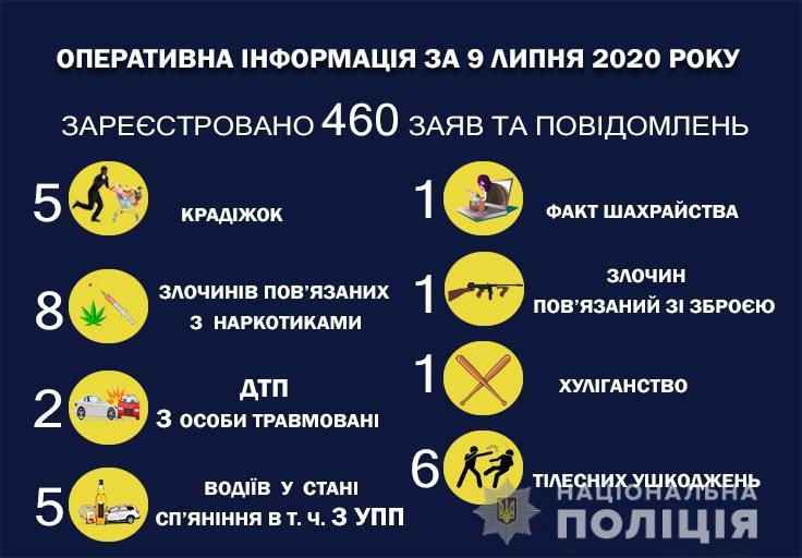 На Франківщині загалом зареєстрували 460 заяв та повідомлень, з них: 5 крадіжок; 8 злочинів пов'язаних з наркотиками; 2 ДТП; 5 водіїв у стані сп'яніння; 6 тілесних ушкоджень.