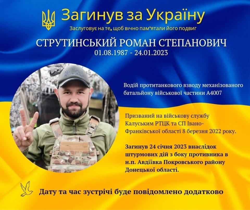 Під час виконання бойового завдання загинув Іван Бужора, житель селища Оболоння Калуського району Роман Струтинський.