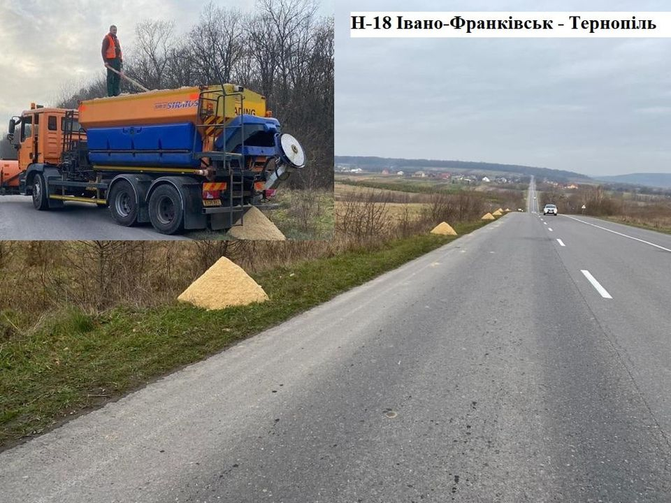 Крім того, на дорогах державного значення провели формування конусів із протиожеледного матеріалу, зокрема на а/д Н-18 Івано-Франківськ – Тернопіль. Для попередження слизькості техніка підрядних підприємств протягом ночі обробляла спуски-підйоми доріг державного значення піщаносольовою сумішшю.