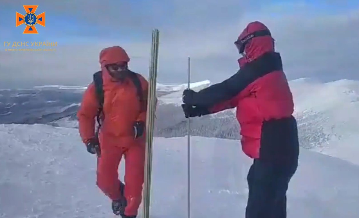 Прикарпатські рятувальники спільно з волонтером туристичного притулку "Смотрич" встановлюють стовпці для орієнтування під час зимових походів, а також таблички з інформацією про ділянки із загрозою лавинонебезпечності.