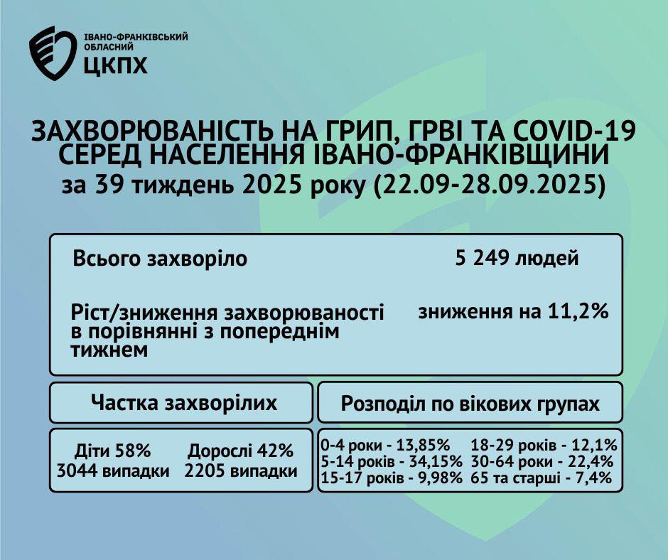 Упродовж 39-го тижня 2024-2025 років в області на ГРВІ, грип та COVID-19 захворіло 5249 осіб проти 5913 осіб за 38 тиждень. Зниження захворюваності відзначають на 11,2%. У тому числі на COVID-19 захворіло 209 осіб.